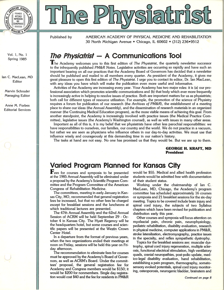 The name of the organization continually evolved. What began as the American Society of Physical Therapy Physicians in 1938 became the American Society of Physical Medicine in 1944. In 1951, the words “and Rehabilitation” were added. The present name, “The American Academy of Physical Medicine and Rehabilitation, was adopted in 1955.